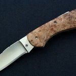 This knife features a 154CM S/S Drop Point blade that is hollow ground with spalted maple handle slabs, titanium liners with colored filework, fileworked blade and spine. The blade measures 2 x 3/4 x 1/8 while the knife measures 5 3/8 when open.