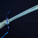 This sword is 4 billets of meteorite mosaic composite Damascus with the center cross logo repeating down the mosaic center billet shown with strips which are also of meteorite Damascus, with twisted meteorite Damascus both above and below then a liner striped tool steel Damascus for a convex ground cutting edge that is 13" long by 1/4" inch thick at the spine and you have one great piece of art. Striped meteorite Damascus fittings front and rear with a 1084 tool steel "S" guard and rear guard blued to match with blue expansion spacers to protect the sculpted mammoth tooth handle. It comes with a multi-colored snake skin inlayed leather slip sheath.