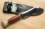 5" in length, crown stag, black, red, and sterling silver spacers. Stacked leather handle, guard is sterling silver. Forged 1098 steel. Drop in sheath scagle style.