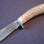 This is a small utility knife with a 3 billet composite. It sports a nickel twist core billet with a heavy etch. It is a convex ground 3 1/4" by 1/8". The knife measures 8" overall in length. Antler tine handle with cable Damascus guards and red stone inlay secured by a twisted stainless steel wire anchor. Red expansion spacers protects against thermal fractures in the handle material. It comes with a smooth leather pocket sheath that fits almost anywhere.