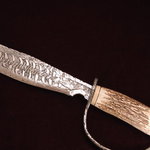 This 3 billet mirror image composite mosaic Damascus is a mouthful even to say. The middle billet hosts the center cross image all the way through the blade to produce an almost identical image on the opposite side of the blade. Meteorite makes out of this world steel and mosaics are amazing patterns manipulated through the steel. Nickel twist Damascus fittings with antler handles are set off by ivory micarta spacers at each end. Black expansion spacers protect the handle from thermal expansions. A hand tooled leather sheath comes with this knife.